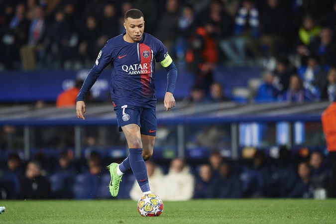 Kylian Mbappe of Paris Saint Germain runs with the ball during the UEFA Champions League match between Real Sociedad v Paris Saint Germain at Reale Arena on March 5, 2024 in San Sebastian (Photo by: LGM)