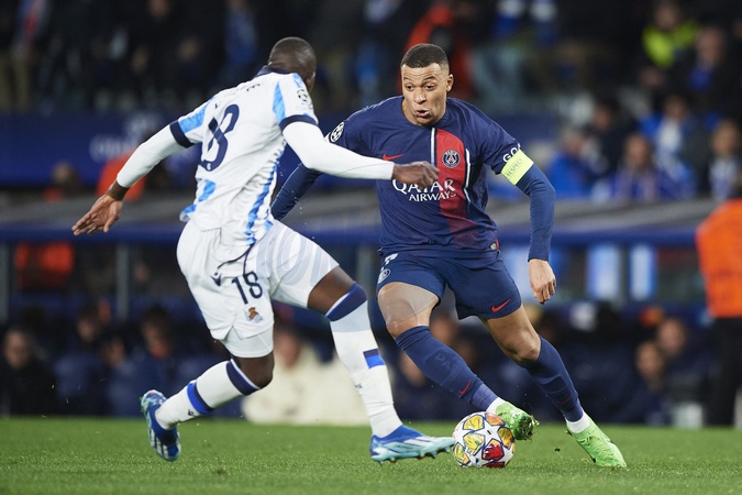 Kylian Mbappe of Paris Saint Germain dribbles during the UEFA Champions League match between Real Sociedad v Paris Saint Germain at Reale Arena on March 5, 2024 in San Sebastian (Photo by: LGM)