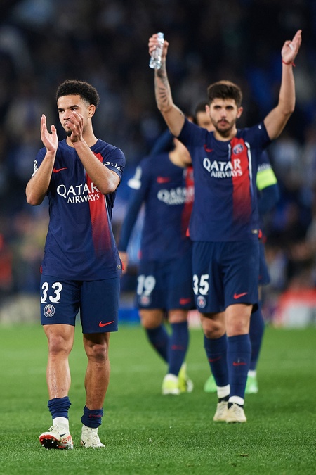 Warren Zaire-Emery of Paris Saint Germain thanks supporters for standing during the UEFA Champions League match between Real Sociedad v Paris Saint Germain at Reale Arena on March 5, 2024 in San Sebastian (Photo by: LGM)