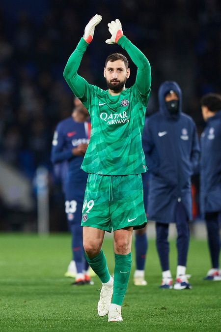 Gianluigi Donnarumma of Paris Saint Germain thanks supporters for standing during the UEFA Champions League match between Real Sociedad v Paris Saint Germain at Reale Arena on March 5, 2024 in San Sebastian (Photo by: LGM)