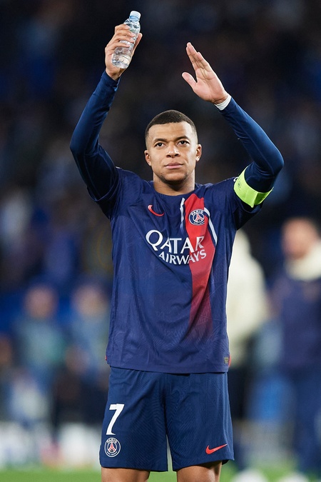 Kylian Mbappe of Paris Saint Germain thanks supporters for standing during the UEFA Champions League match between Real Sociedad v Paris Saint Germain at Reale Arena on March 5, 2024 in San Sebastian (Photo by: LGM)