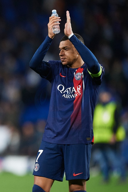 Kylian Mbappe of Paris Saint Germain thanks supporters for standing during the UEFA Champions League match between Real Sociedad v Paris Saint Germain at Reale Arena on March 5, 2024 in San Sebastian (Photo by: LGM)