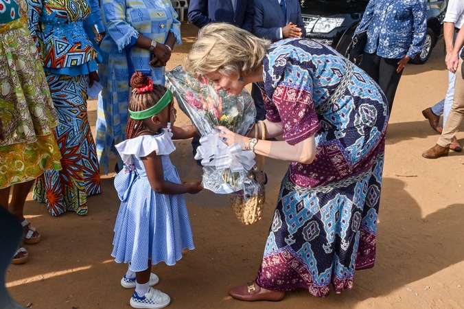 Côte d'Ivoire, Yopougon, 05 mars 2024 Sa Majesté la Reine Mathilde de Belgique lors de la mission de l'ONU en Côte d'Ivoire. Visite de l'école maternelle « Mamie Faitai » à Yopougon, construite en briques plastiques fabriquées par Conceptos plásticos Accueil par le Directeur de l'école maternelle, le Directeur Général de l'Éducation Nationale Ivoirienne et le Directeur de toute l'école ; musique et danses ; les enfants de l'école primaire accueillent la Reine. Petite explication des briques devant le mur de l'école Visite d'une classe avec des enfants (3-5 ans) : les enfants chantent une chanson de bienvenue + elle s'assoit brièvement avec eux. Ivory Coast, Yopougon, 05 March 2024 His Majesty Queen Mathilde Belgium during the mission for the UN in Ivory Coast. Visit of preschool "Mamie Faitai” in Yopougon, built out of plastic bricks made by Conceptos plásticos Welcome by the Principal of the preschool, the Director-General of the Ivorian National Education and the Director of the entire school; music and dances; children from the primary school welcome the Queen. Short explanation of the bricks in front of the wall of the school Visit of a class with children (3-5 years old): children sing welcome song + she shortly sits with them © F.Andrieu / Agencepeps