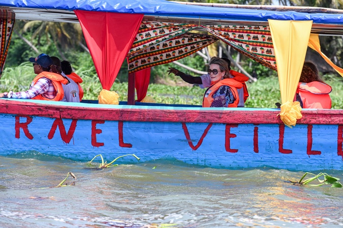 Côte d'Ivoire, Grand Lahou, 05 mars 2024 Sa Majesté la Reine Mathilde de Belgique lors de la mission de l'ONU en Côte d'Ivoire. Voyage en bateau jusqu'à la communauté de pêcheurs de Grand-Lahou. Visite de Grand-Lahou et de son cimetière. Rencontre avec les communautés locales de pêcheurs menacées par la montée du niveau de la mer. Voyage en bateau jusqu'à l'Embarcadère Grand-Lahou avec passage à travers les mangroves. Ivory Coast, Grand Lahou, 05 March 2024 His Majesty Queen Mathilde Belgium during the mission for the UN in Ivory Coast. Travel by boat to fishing community in Grand-Lahou. Visit of Grand-Lahou and its cemetery. Meeting with the local fishing communities threatened by the rising sea levels. Travel by boat to Embarcadère Grand-Lahou with passage through the mangroves. © F.Andrieu / Agencepeps