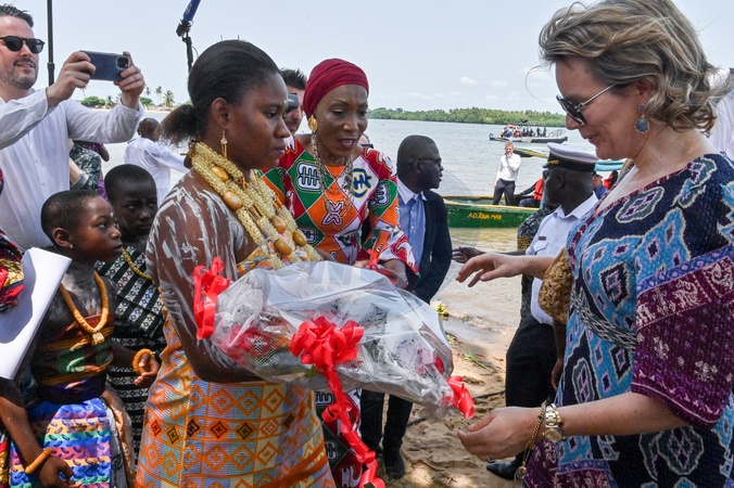 Côte d'Ivoire, Grand Lahou, 05 mars 2024 Sa Majesté la Reine Mathilde de Belgique lors de la mission de l'ONU en Côte d'Ivoire. Voyage en bateau jusqu'à la communauté de pêcheurs de Grand-Lahou. Visite de Grand-Lahou et de son cimetière. Rencontre avec les communautés locales de pêcheurs menacées par la montée du niveau de la mer. Voyage en bateau jusqu'à l'Embarcadère Grand-Lahou avec passage à travers les mangroves. Ivory Coast, Grand Lahou, 05 March 2024 His Majesty Queen Mathilde Belgium during the mission for the UN in Ivory Coast. Travel by boat to fishing community in Grand-Lahou. Visit of Grand-Lahou and its cemetery. Meeting with the local fishing communities threatened by the rising sea levels. Travel by boat to Embarcadère Grand-Lahou with passage through the mangroves. © F.Andrieu / Agencepeps