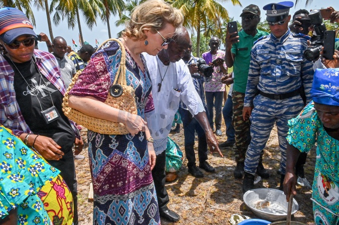 Côte d'Ivoire, Grand Lahou, 05 mars 2024 Sa Majesté la Reine Mathilde de Belgique lors de la mission de l'ONU en Côte d'Ivoire. Voyage en bateau jusqu'à la communauté de pêcheurs de Grand-Lahou. Visite de Grand-Lahou et de son cimetière. Rencontre avec les communautés locales de pêcheurs menacées par la montée du niveau de la mer. Voyage en bateau jusqu'à l'Embarcadère Grand-Lahou avec passage à travers les mangroves. Ivory Coast, Grand Lahou, 05 March 2024 His Majesty Queen Mathilde Belgium during the mission for the UN in Ivory Coast. Travel by boat to fishing community in Grand-Lahou. Visit of Grand-Lahou and its cemetery. Meeting with the local fishing communities threatened by the rising sea levels. Travel by boat to Embarcadère Grand-Lahou with passage through the mangroves. © F.Andrieu / Agencepeps