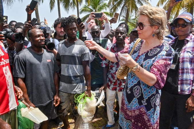 Côte d'Ivoire, Grand Lahou, 05 mars 2024 Sa Majesté la Reine Mathilde de Belgique lors de la mission de l'ONU en Côte d'Ivoire. Voyage en bateau jusqu'à la communauté de pêcheurs de Grand-Lahou. Visite de Grand-Lahou et de son cimetière. Rencontre avec les communautés locales de pêcheurs menacées par la montée du niveau de la mer. Voyage en bateau jusqu'à l'Embarcadère Grand-Lahou avec passage à travers les mangroves. Ivory Coast, Grand Lahou, 05 March 2024 His Majesty Queen Mathilde Belgium during the mission for the UN in Ivory Coast. Travel by boat to fishing community in Grand-Lahou. Visit of Grand-Lahou and its cemetery. Meeting with the local fishing communities threatened by the rising sea levels. Travel by boat to Embarcadère Grand-Lahou with passage through the mangroves. © F.Andrieu / Agencepeps
