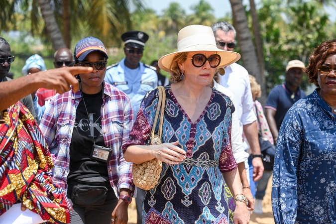 Côte d'Ivoire, Grand Lahou, 05 mars 2024 Sa Majesté la Reine Mathilde de Belgique lors de la mission de l'ONU en Côte d'Ivoire. Voyage en bateau jusqu'à la communauté de pêcheurs de Grand-Lahou. Visite de Grand-Lahou et de son cimetière. Rencontre avec les communautés locales de pêcheurs menacées par la montée du niveau de la mer. Voyage en bateau jusqu'à l'Embarcadère Grand-Lahou avec passage à travers les mangroves. Ivory Coast, Grand Lahou, 05 March 2024 His Majesty Queen Mathilde Belgium during the mission for the UN in Ivory Coast. Travel by boat to fishing community in Grand-Lahou. Visit of Grand-Lahou and its cemetery. Meeting with the local fishing communities threatened by the rising sea levels. Travel by boat to Embarcadère Grand-Lahou with passage through the mangroves. © F.Andrieu / Agencepeps