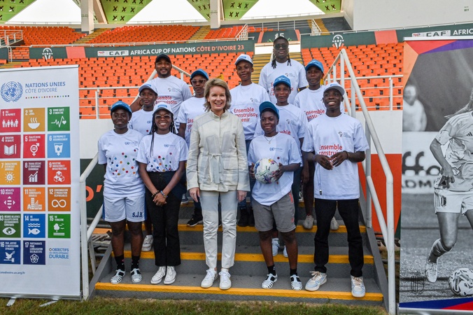 Côte d'Ivoire, San Pedro, 05 mars 2024 Sa Majesté la Reine Mathilde de Belgique lors de la mission de l'ONU en Côte d'Ivoire. Rencontre avec de jeunes athlètes ivoiriens Au Stade Laurent Pokou de San Pedro. Ivory Coast, San Pedro, 05 March 2024 His Majesty Queen Mathilde Belgium during the mission for the UN in Ivory Coast. Meeting with young Ivorian athletes In the Stade Laurent Pokou de San Pedro. © F.Andrieu / Agencepeps