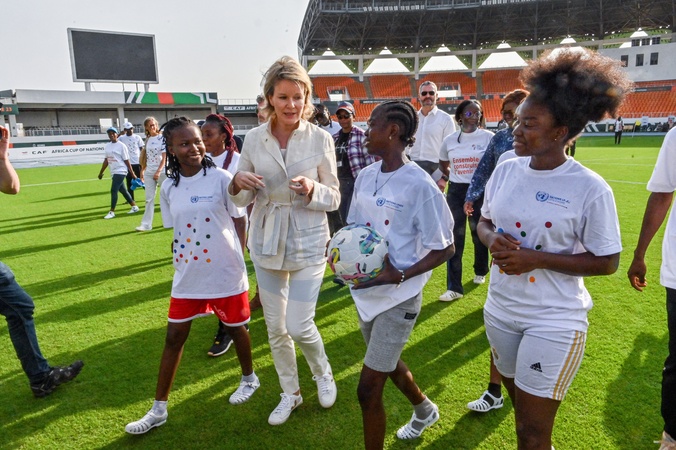 Côte d'Ivoire, San Pedro, 05 mars 2024 Sa Majesté la Reine Mathilde de Belgique lors de la mission de l'ONU en Côte d'Ivoire. Rencontre avec de jeunes athlètes ivoiriens Au Stade Laurent Pokou de San Pedro. Ivory Coast, San Pedro, 05 March 2024 His Majesty Queen Mathilde Belgium during the mission for the UN in Ivory Coast. Meeting with young Ivorian athletes In the Stade Laurent Pokou de San Pedro. © F.Andrieu / Agencepeps