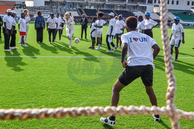 Côte d'Ivoire, San Pedro, 05 mars 2024 Sa Majesté la Reine Mathilde de Belgique lors de la mission de l'ONU en Côte d'Ivoire. Rencontre avec de jeunes athlètes ivoiriens Au Stade Laurent Pokou de San Pedro. Ivory Coast, San Pedro, 05 March 2024 His Majesty Queen Mathilde Belgium during the mission for the UN in Ivory Coast. Meeting with young Ivorian athletes In the Stade Laurent Pokou de San Pedro. © F.Andrieu / Agencepeps