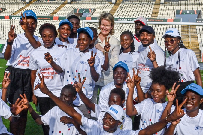 Côte d'Ivoire, San Pedro, 05 mars 2024 Sa Majesté la Reine Mathilde de Belgique lors de la mission de l'ONU en Côte d'Ivoire. Rencontre avec de jeunes athlètes ivoiriens Au Stade Laurent Pokou de San Pedro. Ivory Coast, San Pedro, 05 March 2024 His Majesty Queen Mathilde Belgium during the mission for the UN in Ivory Coast. Meeting with young Ivorian athletes In the Stade Laurent Pokou de San Pedro. © F.Andrieu / Agencepeps