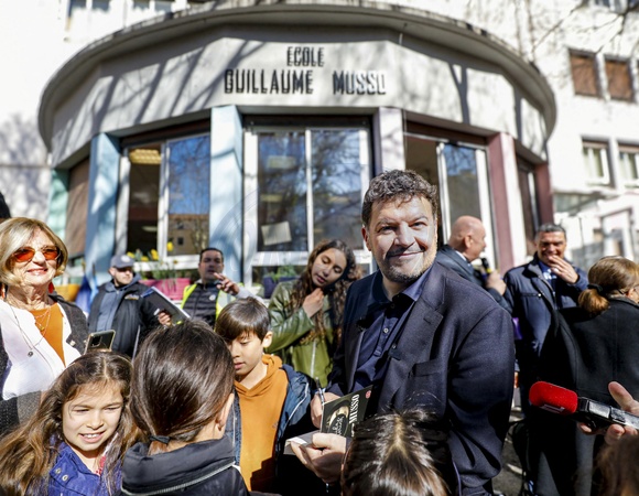L'école élémentaire "Juan Gare" est rebaptisée école Guillaume Musso en plein centre ville de Juan-les-Pins en présence de l'auteur aux 34 millions de livres vendus dans le monde le 4 mars 2024. Le maire, Jean Leonetti, est très fier de ce baptême dont il a eu l'idée. Il espère que ce geste permettra aux enfants de l'école de nourrir des projets d'écriture et peut-être de révéler des talents de demain. Face aux parents de Guillaume Musso présents dans la foule (deux Antibois), il rappelle toute l'histoire azuréenne de l'auteur. Professeur d'abord, puis écrivain ensuite, il n'oublie jamais de revenir sur ses terres. © Frantz Bouton / Nice Matin / Bestimage The "Juan Gare" primary schools was renamed the Guillaume Musso school in the centre of Juan-les-Pins in the presence of the author of 34 million books sold worldwide on 4 March 2024. Mayor Jean Leonetti is very proud of the naming, which was his idea. He hopes that this gesture will enable the children at the school to develop their writing projects and perhaps reveal the talents of tomorrow. In front of Guillaume Musso's parents in the crowd (two from Antibes), he recalled the author's Côte d'Azur history. First a teacher, then a writer, he never forgets to return to his homeland.