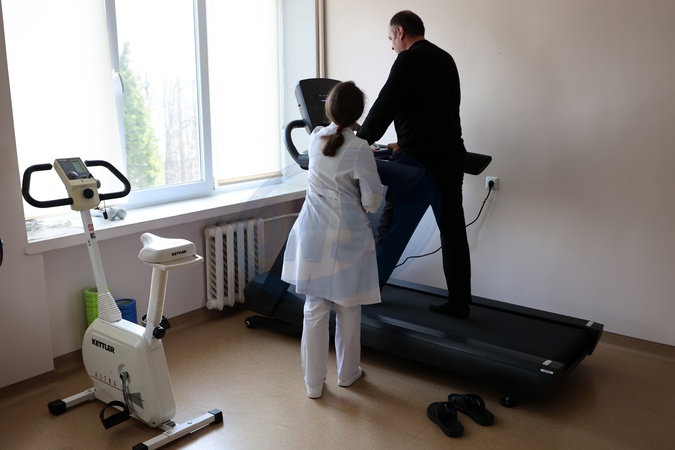 KALUSH, UKRAINE - MARCH 4, 2024 - A healthcare provider watches over a man exercising on the treadmill in the Medical Rehabilitation and Physical Therapy Department of the Kalush Central District Hospital, Kalush, Ivano-Frankivsk region, western Ukraine., Credit:Yurii Rylchuk / Avalon