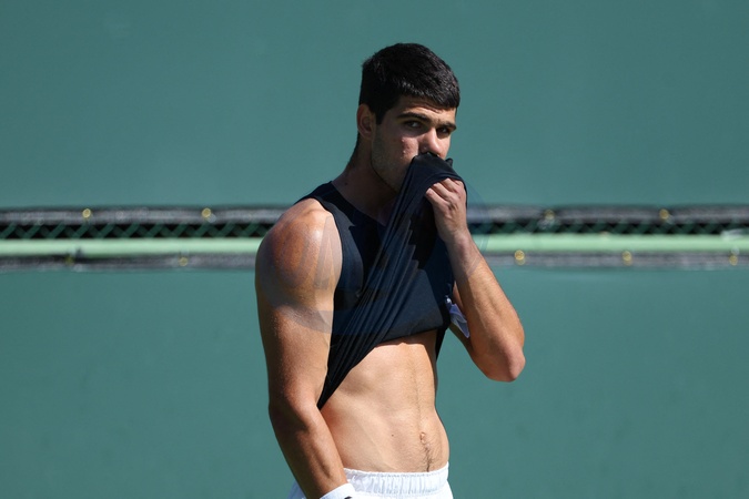 Carlos Alcaraz (Spa) - Les joueurs s'entraînent avant le tournoi de tennis du BNP Paribas Open d'Indian Wells (Indian Wells Masters) en Californie le 6 mars 2024. Players practice before the BNP Paribas Indian Wells Open tennis tournament (Indian Wells Masters) in California on March 6, 2024.