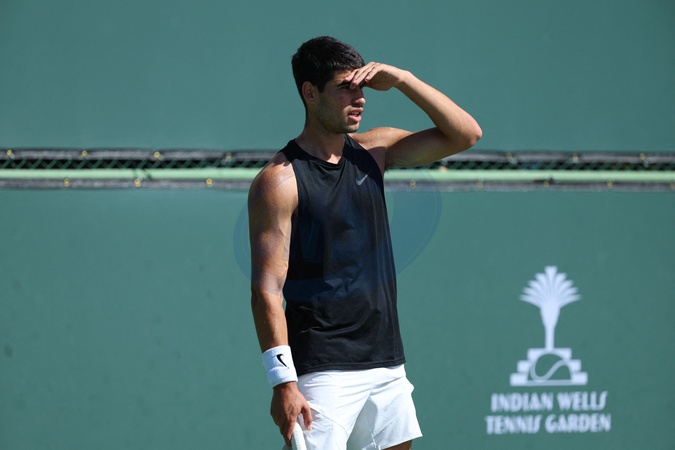 Carlos Alcaraz (Spa) - Les joueurs s'entraînent avant le tournoi de tennis du BNP Paribas Open d'Indian Wells (Indian Wells Masters) en Californie le 6 mars 2024. Players practice before the BNP Paribas Indian Wells Open tennis tournament (Indian Wells Masters) in California on March 6, 2024.