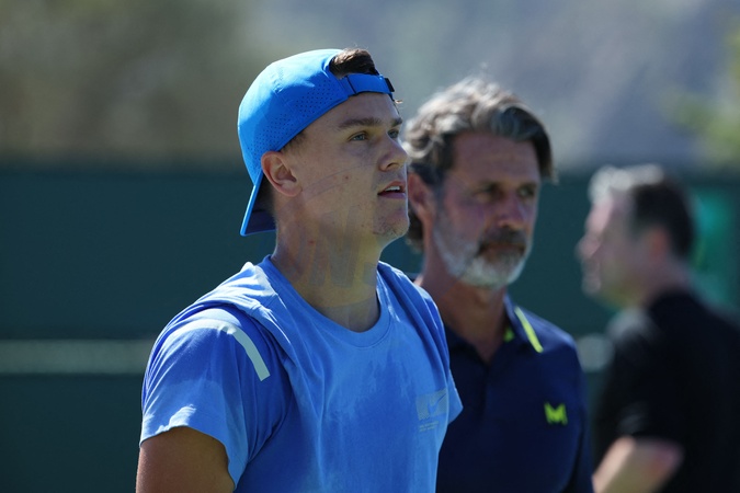 Holger Rune and Patrick Mouratoglou - Les joueurs s'entraînent avant le tournoi de tennis du BNP Paribas Open d'Indian Wells (Indian Wells Masters) en Californie le 6 mars 2024. Players practice before the BNP Paribas Indian Wells Open tennis tournament (Indian Wells Masters) in California on March 6, 2024.