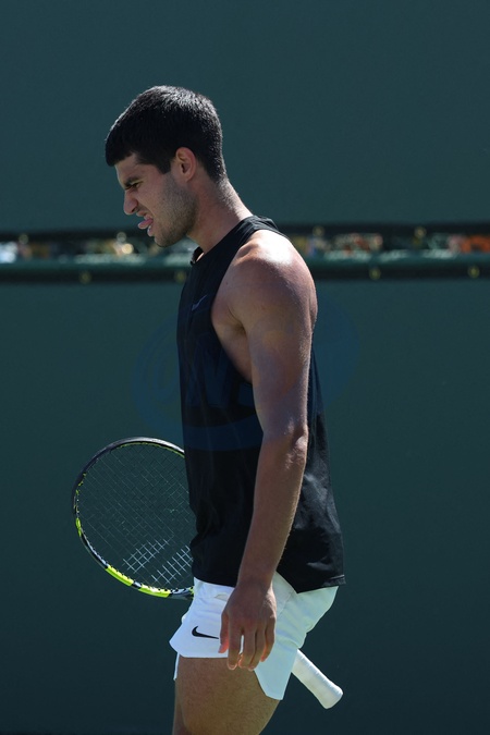 Carlos Alcaraz (Spa) - Les joueurs s'entraînent avant le tournoi de tennis du BNP Paribas Open d'Indian Wells (Indian Wells Masters) en Californie le 6 mars 2024. Players practice before the BNP Paribas Indian Wells Open tennis tournament (Indian Wells Masters) in California on March 6, 2024.