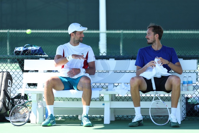 Novak Djokovic (Ser) and Daniil Medvedev - Les joueurs s'entraînent avant le tournoi de tennis du BNP Paribas Open d'Indian Wells (Indian Wells Masters) en Californie le 6 mars 2024. Players practice before the BNP Paribas Indian Wells Open tennis tournament (Indian Wells Masters) in California on March 6, 2024.