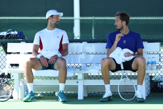 Novak Djokovic (Ser) and Daniil Medvedev - Les joueurs s'entraînent avant le tournoi de tennis du BNP Paribas Open d'Indian Wells (Indian Wells Masters) en Californie le 6 mars 2024. Players practice before the BNP Paribas Indian Wells Open tennis tournament (Indian Wells Masters) in California on March 6, 2024.
