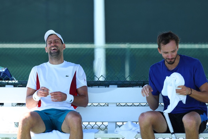 Novak Djokovic (Ser) and Daniil Medvedev - Les joueurs s'entraînent avant le tournoi de tennis du BNP Paribas Open d'Indian Wells (Indian Wells Masters) en Californie le 6 mars 2024. Players practice before the BNP Paribas Indian Wells Open tennis tournament (Indian Wells Masters) in California on March 6, 2024.