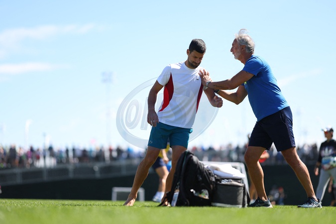 Novak Djokovic (Ser) and Marco Panichi, physical trainer - Les joueurs s'entraînent avant le tournoi de tennis du BNP Paribas Open d'Indian Wells (Indian Wells Masters) en Californie le 6 mars 2024. Players practice before the BNP Paribas Indian Wells Open tennis tournament (Indian Wells Masters) in California on March 6, 2024.