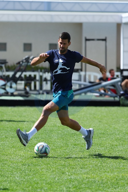 Novak Djokovic (Ser) playing soccer - Les joueurs s'entraînent avant le tournoi de tennis du BNP Paribas Open d'Indian Wells (Indian Wells Masters) en Californie le 6 mars 2024. Players practice before the BNP Paribas Indian Wells Open tennis tournament (Indian Wells Masters) in California on March 6, 2024.