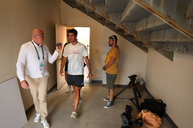Carlos Alcaraz (Spa) - Les joueurs s'entraînent avant le tournoi de tennis du BNP Paribas Open d'Indian Wells (Indian Wells Masters) en Californie le 6 mars 2024. Players practice before the BNP Paribas Indian Wells Open tennis tournament (Indian Wells Masters) in California on March 6, 2024.
