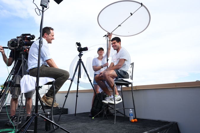 Carlos Alcaraz (Spa) - Les joueurs s'entraînent avant le tournoi de tennis du BNP Paribas Open d'Indian Wells (Indian Wells Masters) en Californie le 6 mars 2024. Players practice before the BNP Paribas Indian Wells Open tennis tournament (Indian Wells Masters) in California on March 6, 2024.