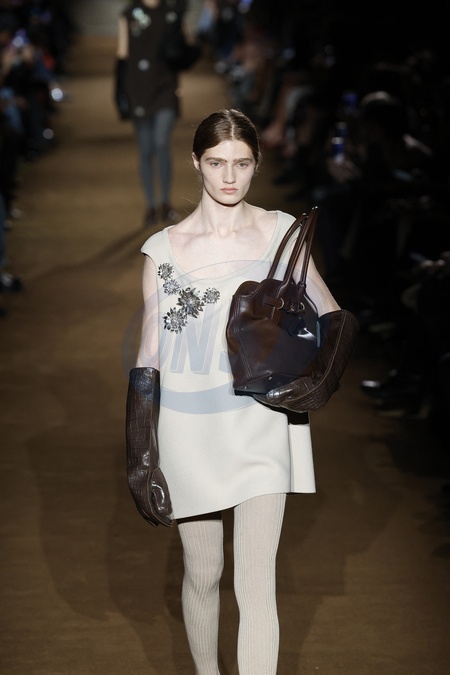 Défilé de mode Miu Miu collection femme automne/hiver 2024-2025 lors de la fashion week à Paris (PFW) le 5 mars 2024. A model wearing an original creation from the womenswear winter 2024 collections in Paris from the house of Miu Miu Miu Miu women's autumn/winter 2024-2025 fashion show at Paris Fashion Week (PFW) on 5 March 2024