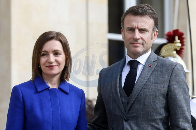 Le président français, Emmanuel Macron reçoit la présidente de la République de Moldavie, Maia Sandu pour un déjeuner de travail au palais présidentiel de l'Elysée à Paris
