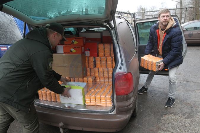 DNIPRO, UKRAINE - FEBRUARY 15, 2024 - Latvian volunteers brought food (pasta and cereals) to one of the hospitals in Dnipro, eastern Ukraine., Credit:Mykola Miakshykov / Avalon