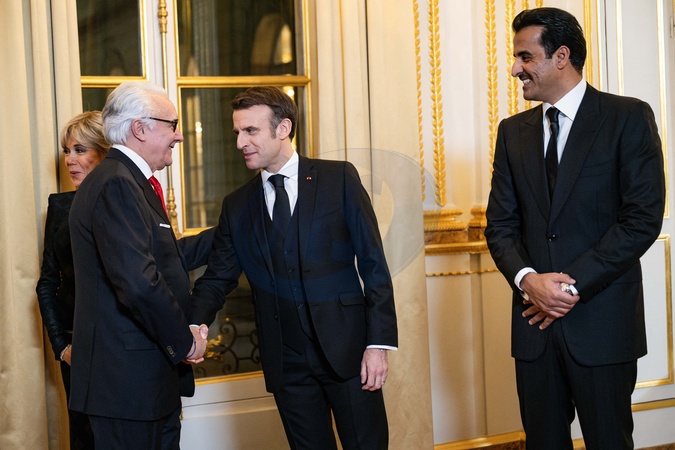 Le président Emmanuel Macron et l'émir du Qatar accueillent les invités au dîner d'état en l'honneur de l'émir au palais de l'Elysée à Paris