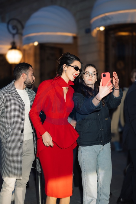 Exclusif - Kendall Jenner à la sortie du Ritz à Paris le 8 mars 2024. © Tiziano da Silva / Bestimage Exclusive - Kendall Jenner wearing red outfit while leaving Ritz Hotel in Paris on 08/03/2024