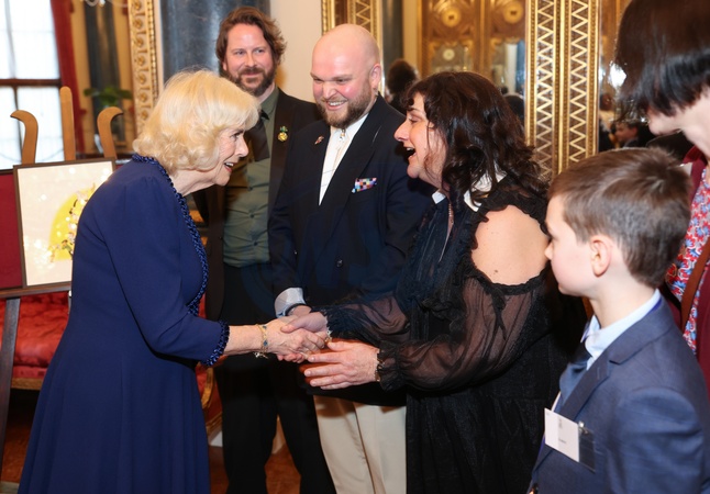 LONDON, ENGLAND - FEBRUARY 28: In this image released March 7, Queen Camilla shakes hands with a guest during a reception for the BBC's 500 Words Finalists at Buckingham Palace on February 28, 2024 in London, England., Credit:Chris Jackson / Avalon