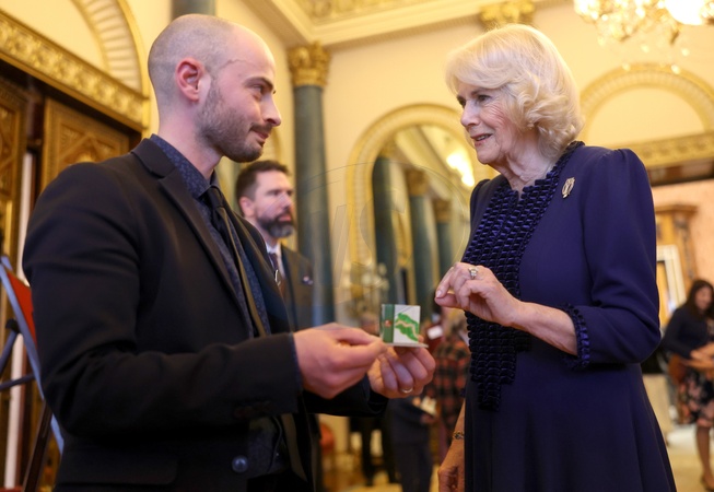 LONDON, ENGLAND - FEBRUARY 28: In this image released March 7, Queen Camilla speaks to a guest during a reception for the BBC's 500 Words Finalists at Buckingham Palace on February 28, 2024 in London, England., Credit:Chris Jackson / Avalon