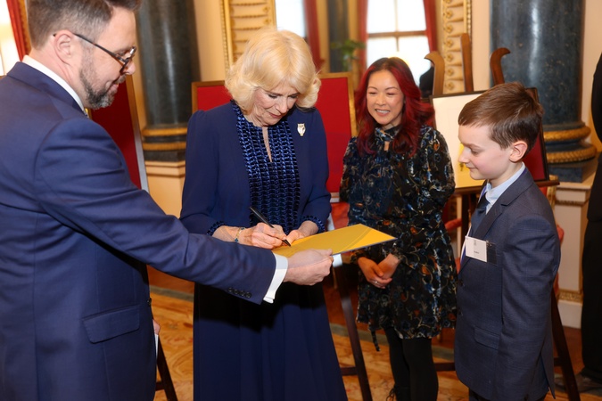 LONDON, ENGLAND - FEBRUARY 28: In this image released March 7, Queen Camilla signs a book during a reception for the BBC's 500 Words Finalists at Buckingham Palace on February 28, 2024 in London, England., Credit:Chris Jackson / Avalon