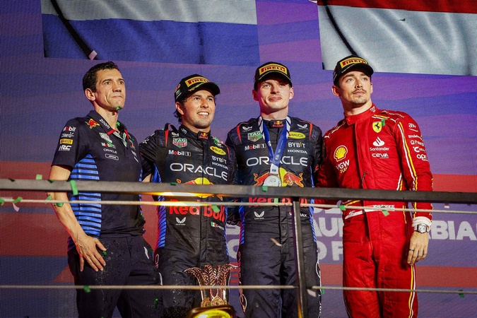 Max Verstappen remporte le grand prix de formule 1 d'Arabie Saoudite le 9 mars 2024. © Dppi / Panoramic / Bestimage VERSTAPPEN Max (ned), Red Bull Racing RB20, PEREZ Sergio (mex), Red Bull Racing RB20 and LECLERC Charles (mco), Scuderia Ferrari SF-24, portrait, podium during the Formula 1 STC Saudi Arabian Grand Prix 2024, 2nd round of the 2024 Formula One World Championship from March 7 to 9, 2024 on the Jeddah Corniche Circuit, in Jeddah, Saudi Arabia -