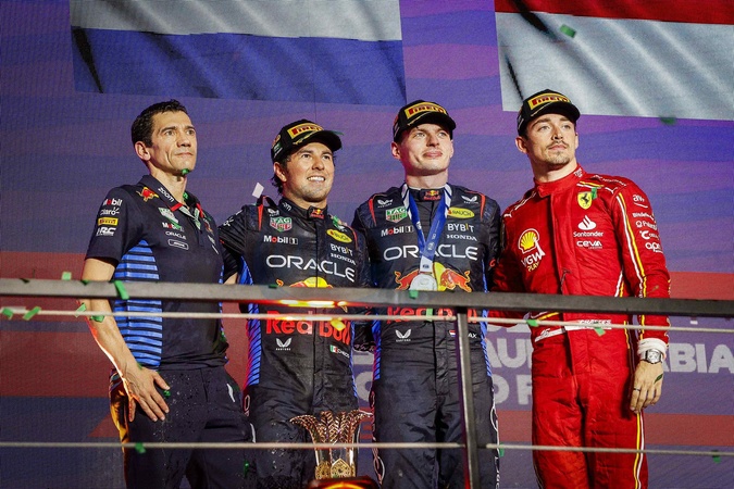 Max Verstappen remporte le grand prix de formule 1 d'Arabie Saoudite le 9 mars 2024. © Dppi / Panoramic / Bestimage VERSTAPPEN Max (ned), Red Bull Racing RB20, PEREZ Sergio (mex), Red Bull Racing RB20 and LECLERC Charles (mco), Scuderia Ferrari SF-24, portrait, podium during the Formula 1 STC Saudi Arabian Grand Prix 2024, 2nd round of the 2024 Formula One World Championship from March 7 to 9, 2024 on the Jeddah Corniche Circuit, in Jeddah, Saudi Arabia -