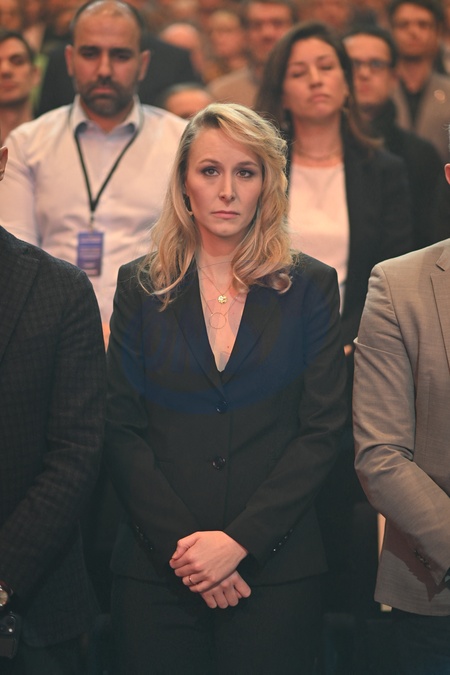Marion Maréchal-Le Pen, tête de liste du parti Reconquête aux élections européennes, donne son premier meeting de campagne au dôme de Paris, le 10 mars 2024. © Pierre Perusseau / Bestimage Marion Maréchal-Le Pen, head of the Reconquest party list in the European elections, gives her first political meeting at the Paris dome on March 10, 2024.