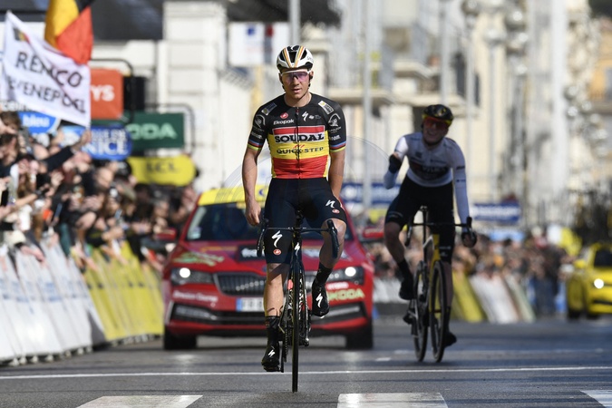 Remco Evenepoel (Soudal Quick-Step) remporte sur la Promenade des Anglais, la hutième et dernière étape du Paris-Nice 2024. © William Cannarella / Panoramic / Bestimage The American Matteo Jorgenson wins the 82nd edition of Paris-Nice and the Belgian Remco Evenepoel the last stage, on March 10th, 2024.