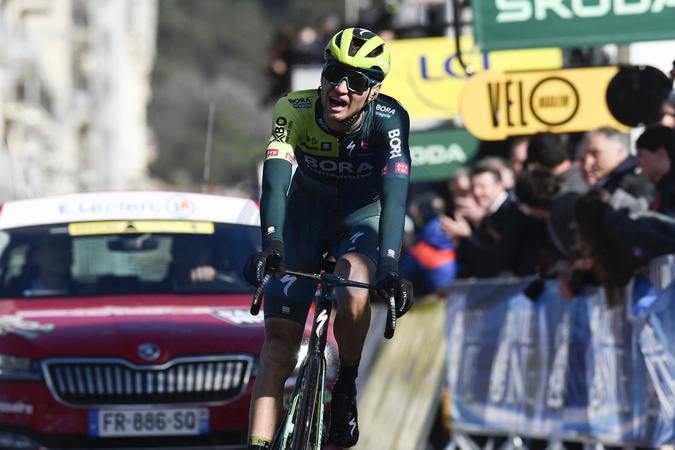 Aleksandr Vlasov (BORA - Hansgrohe) termine cette huitème et dernière étape du Paris-Nice 2024 à la troisième place. © William Cannarella / Panoramic / Bestimage The American Matteo Jorgenson wins the 82nd edition of Paris-Nice and the Belgian Remco Evenepoel the last stage, on March 10th, 2024.