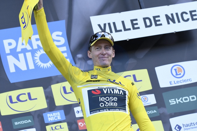l'Américain Matteo Jorgenson (Visma-Lease a Bike) remporte le classement général final du Paris-Nice 2024. © William Cannarella / Panoramic / Bestimage The American Matteo Jorgenson wins the 82nd edition of Paris-Nice and the Belgian Remco Evenepoel the last stage, on March 10th, 2024.