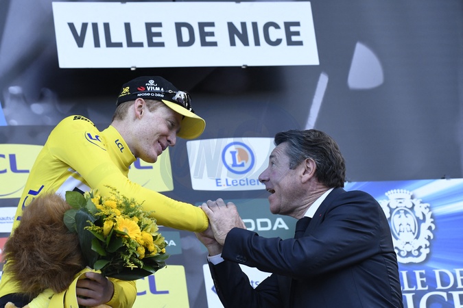 l'Américain Matteo Jorgenson (Visma-Lease a Bike), et Christian Estrosi, maire de Nice, remporte le classement général final du Paris-Nice 2024. © William Cannarella / Panoramic / Bestimage The American Matteo Jorgenson wins the 82nd edition of Paris-Nice and the Belgian Remco Evenepoel the last stage, on March 10th, 2024.