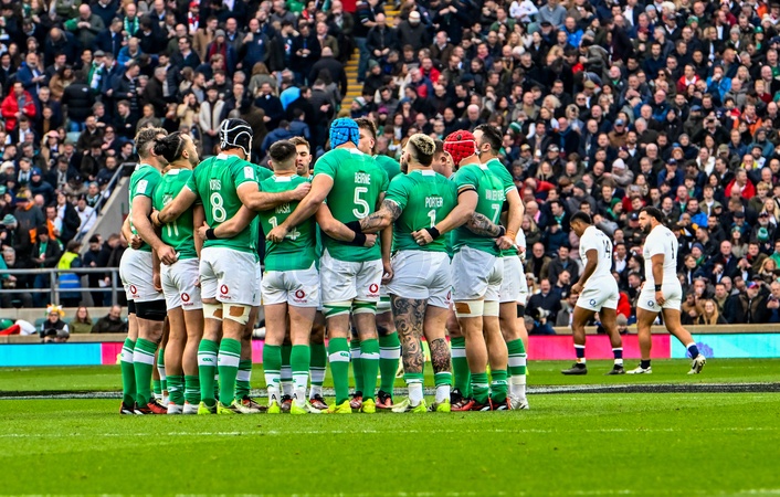 Ireland players huddle before the Guinness Six Nations Rugby Championship match between England and Ireland at Twickenham Stadium in London, England., Credit:Jules Annan / Avalon