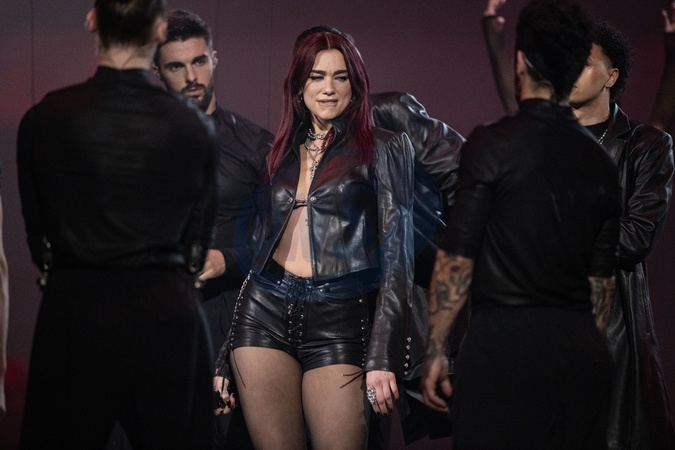Dua Lipa performing live at the 2024 BRIT awards ceremony, O2 Arena, London, on 2 March 2024