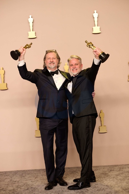 Dave Mullins and Brad Booker pose backstage with the Oscar® for Animated Short Film during the live ABC telecast of the 96th Oscars® at Dolby® Theatre at Ovation Hollywood on Sunday, March 10, 2024., Credit:SRS / Avalon