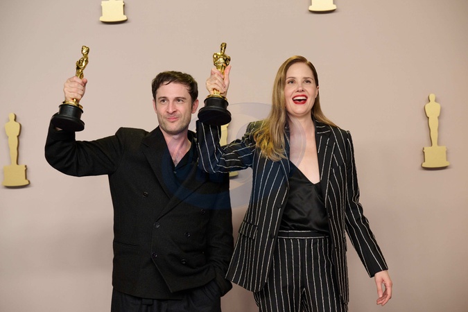 James Price and Shoana Heath pose backstage with the Oscar® for Production Design during the live ABC telecast of the 96th Oscars® at the Dolby® Theatre at Ovation Hollywood on Sunday, March 10, 2024., Credit:sb / Avalon