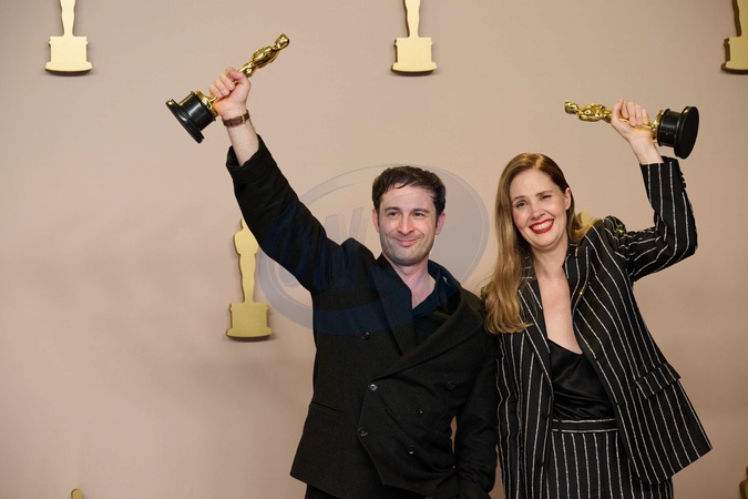 James Price and Shoana Heath pose backstage with the Oscar® for Production Design during the live ABC telecast of the 96th Oscars® at the Dolby® Theatre at Ovation Hollywood on Sunday, March 10, 2024., Credit:sb / Avalon