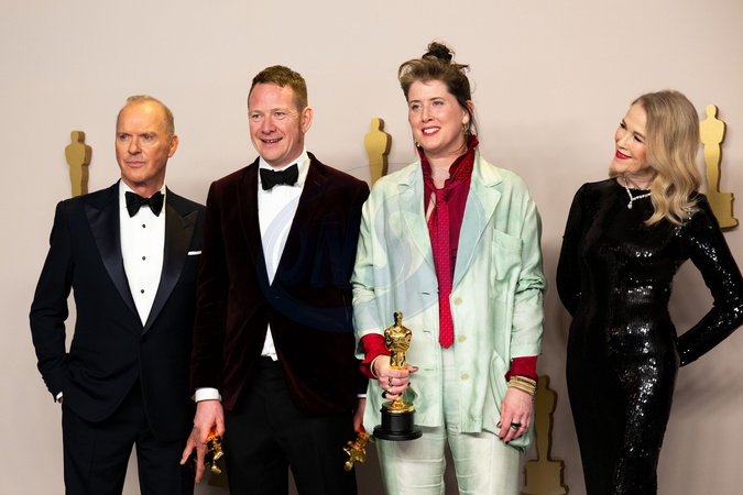 James Price and Shoana Heath pose backstage with the Oscar® for Production Design during the live ABC telecast of the 96th Oscars® at the Dolby® Theatre at Ovation Hollywood on Sunday, March 10, 2024., Credit:Michael Baker / Avalon